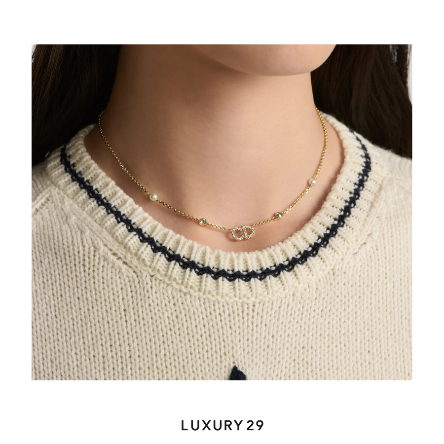 The Clair D Lune necklace reflects the House's understated elegance. A fine gold-finish metal chain is embellished with small white resin pearls and white crystals. The CD signature in the center is also adorned with crystals. The delicate style can be easily coordinated with other jewelry pieces.