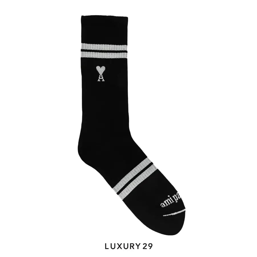 The Ami de Coeur Striped Socks in Black combine playful design with premium comfort, offering a versatile accessory for everyday wear. Crafted from high-quality cotton blend fabric, they provide softness, breathability, and a snug fit that stays comfortable throughout the day. The classic black base is accented with signature Ami de Coeur stripes, adding a subtle yet distinctive touch of personality to any outfit. Designed with reinforced toes and heels, these socks ensure durability and long-lasting wear, while the ribbed cuff helps maintain shape and prevents slipping. Ideal for pairing with sneakers, loafers, or casual footwear, they effortlessly enhance both casual and smart-casual ensembles. A perfect blend of style, comfort, and practicality, these Ami de Coeur socks embody the Maison’s playful yet refined approach to everyday essentials. Lightweight and flexible, they are suitable for year-round wear, making them a must-have addition to any fashion-forward wardrobe.