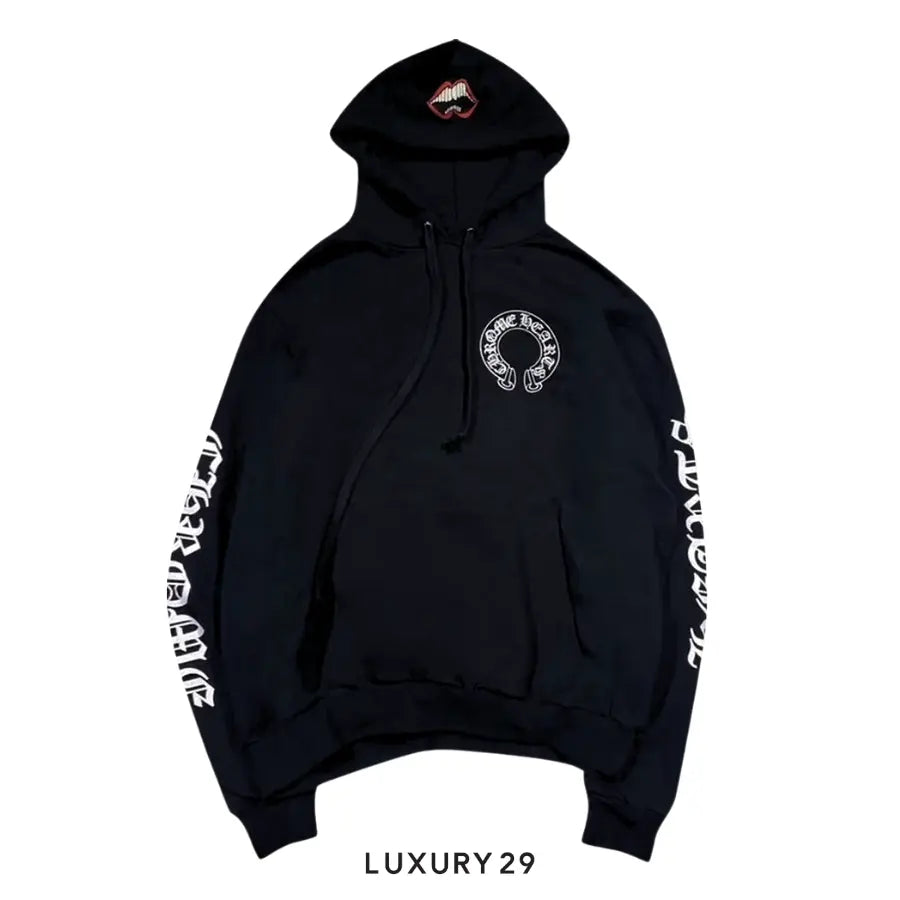 เสื้อฮู้ด Chrome Hearts Matty Boy Chomper Horseshoe สีดำ เป็นเสื้อฮู้ดแบบสวมหัวสีดำที่มีดีไซน์เกือกม้าสีขาวที่ด้านหลัง และปักโลโก้ Chrome Hearts ที่หน้าอก เสื้อฮู้ดยังมีจั๊มพ์แขนและชายเสื้อ และฮู้ดแบบมีเชือกผูก ผลิตจากผ้าคอตตอนเนื้อหนา ดีไซน์เกือกม้าที่ด้านหลัง ปักโลโก้ Chrome Hearts ที่หน้าอก จั๊มพ์แขนและชายเสื้อแบบมีเชือกผูก ฮู้ดแบบพอดีตัว