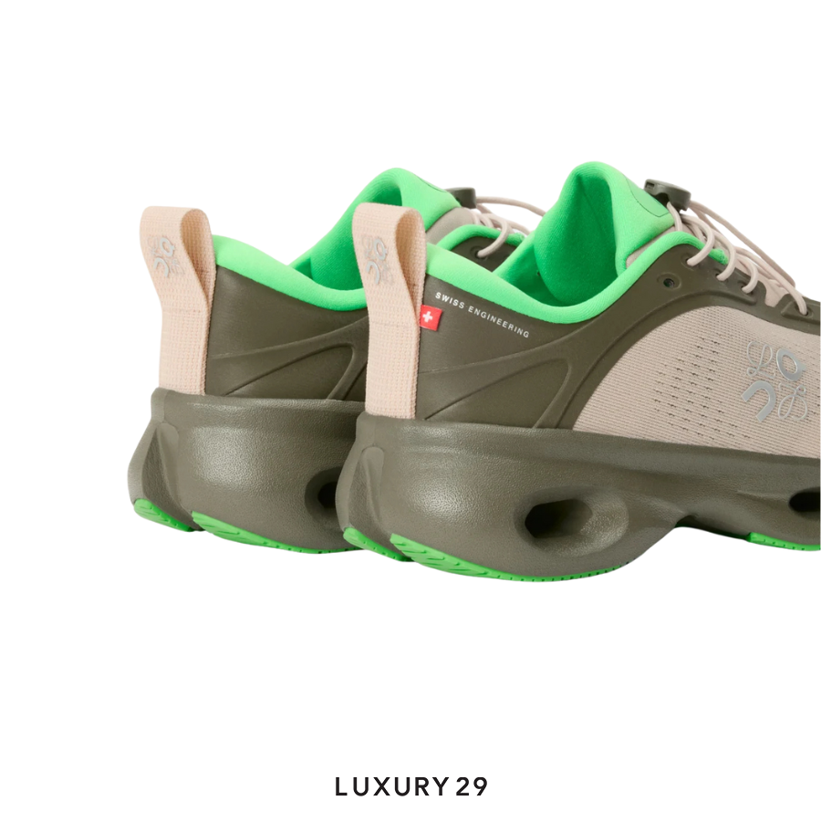 รองเท้าผ้าใบน้ำหนักเบาผลิตจากโพลีเอสเตอร์รีไซเคิล มาพร้อมพื้นรองเท้าโฟมน้ำหนักเบาที่ออกแบบร่วมกันเป็นพิเศษ พร้อมสัญลักษณ์ Cloud เพียงอันเดียวที่ส้นเท้า Cloudsolo ดีไซน์ใหม่ล่าสุด โดดเด่นด้วยส่วนบนที่ทำจากผ้าตาข่ายวิศวกรรมแบบหลายชั้น ผลิตจากเส้นด้ายกึ่งโปร่งแสง พร้อมโอเวอร์เลย์ TPU
